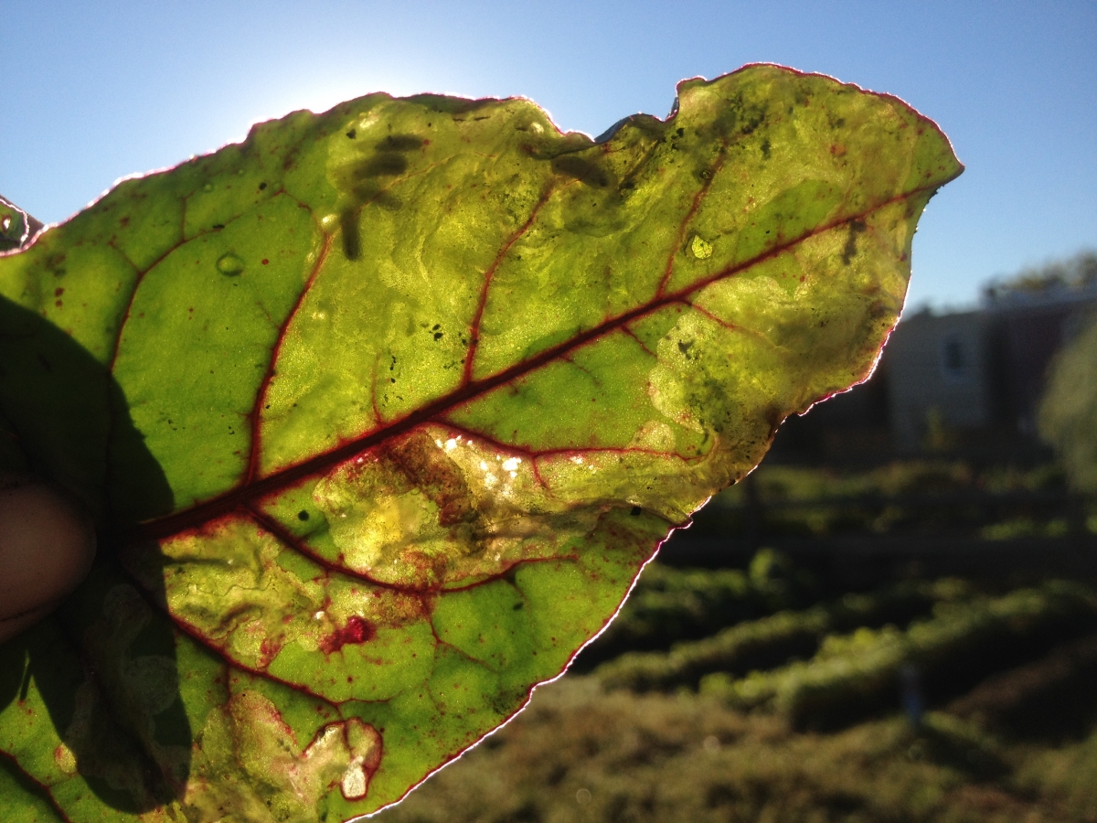 - Leaf miners are another voracious consumer of your precious vegetables. You will find them mining into the leaves of your swiss chard, beet greens and spinach. Remove any damaged leaves that already show evidence of their tunneling, and check the backs of each leaf for their small clusters of eggs.