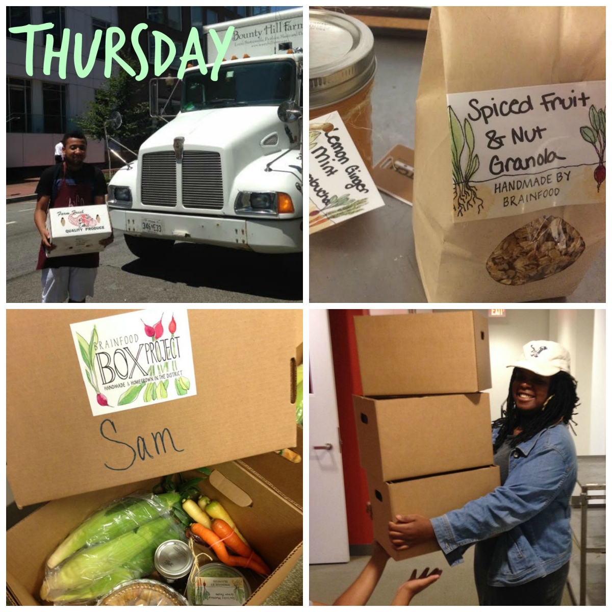 Thursday: It's pick up day! Alfonso helps carry our produce delivery from the truck to the fridge, Myla counts boxes, and everyone pitches in for packaging and final assembly. We all take shifts in the lobby to assist with pick up and meet our fabulous subscribers.