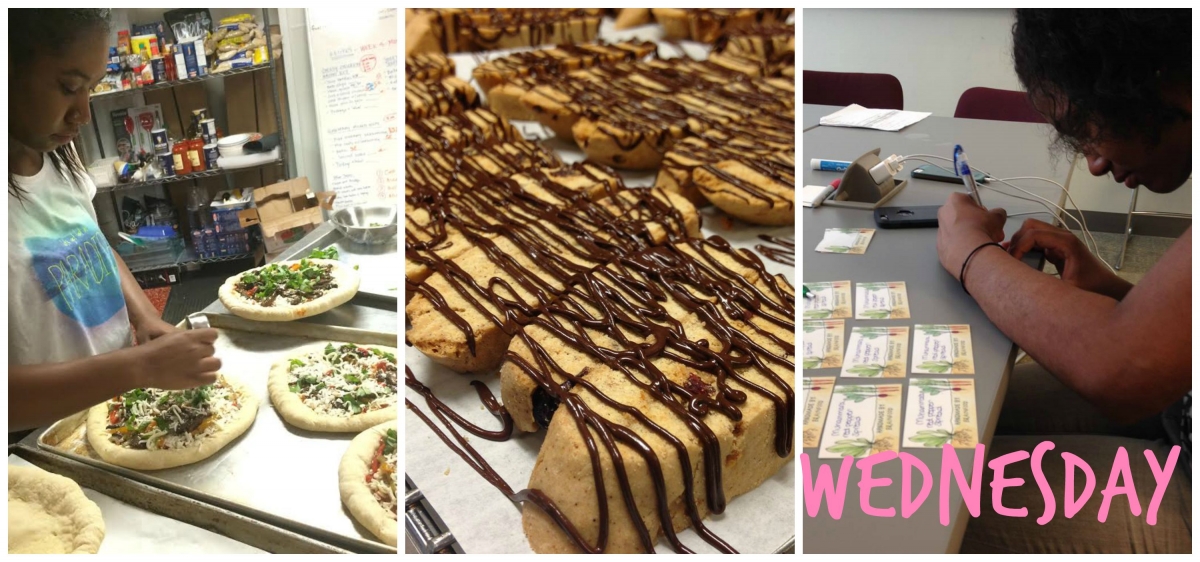 There's plenty to do on Wednesday--just one more day until client pick up! Kaylan puts final touches on pizza, Shawnee drizzles chocolate on biscotti, and Koby handwrites food labels.